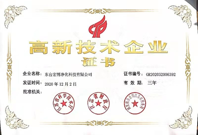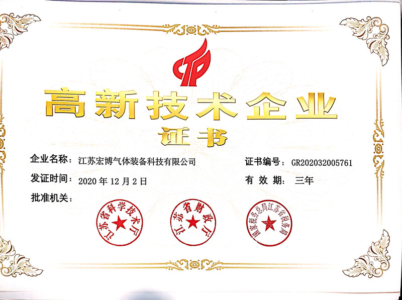 2020年,宏博企業(yè)江蘇宏博氣體裝備科技有限公司,生產(chǎn)基地-東臺(tái)宏博凈化科技有限公司同時(shí)獲評(píng)高新技術(shù)企業(yè),并于近日收到由江蘇省科學(xué)技術(shù)廳、江蘇省財(cái)政廳、國家稅務(wù)總局江蘇省稅務(wù)局聯(lián)合頒發(fā)的《高新技術(shù)企業(yè)證書》。