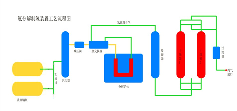 液氨經(jīng)氨減壓閥減壓,進(jìn)入水汽化器,然后進(jìn)入熱交換器和氨分解出來(lái)的氫氣進(jìn)行熱量交換,進(jìn)入分解爐體里,分解成氫氮混合氣,出來(lái)的熱氣體和氨進(jìn)行熱量交換,再進(jìn)入水冷卻器冷卻后,即可送到使用點(diǎn)。
